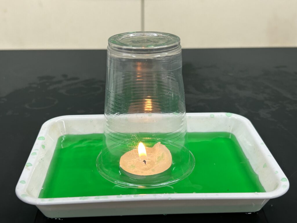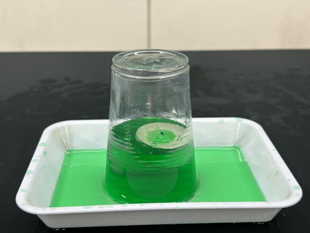 ▽4/12(日)・15(水)1テーマ目実施予定:「エタノールの燃焼と空気」1本目のテーマは、エタノールを内部に塗りつけたカップを火のついたろうそくにかぶせます。エタノールを用いなくても水面は上がってくるのはわかるのですが、さて…?;お問い合わせ・体験申し込み予約
