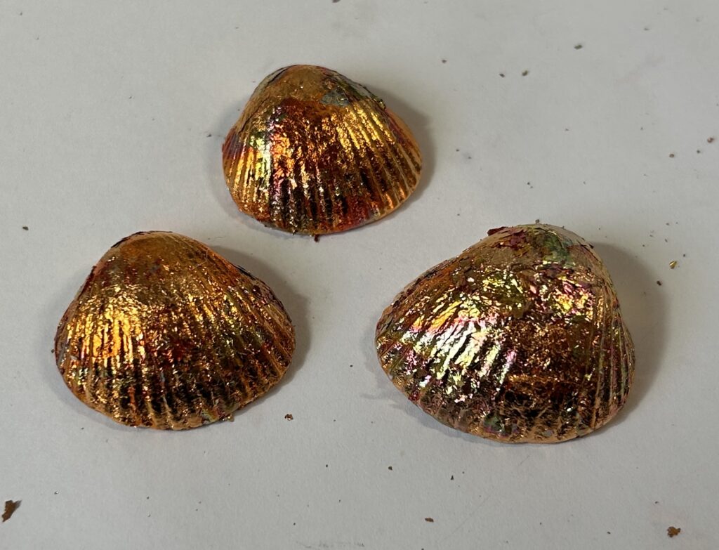 ▽カラフルメタル貝殻:銅箔を加熱して構造色という光の干渉を起こしたものと貝殻に貼りつけるというちょっとアートっぽいテーマ